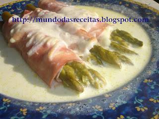 Enrolam-se três espargos numa fatia de queijo e outra de fiambre e prendem-se com um palito. Colocam-se numa travessa que possa ir ao forno. Vertem-se as natas por cima e deita-se um pouco de queijo mozzarella. Vai ao forno a gratinar.