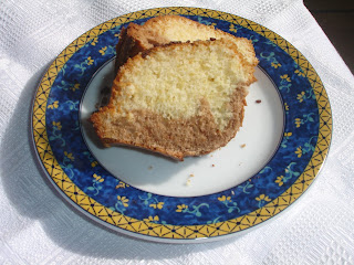 Juntar o cacau à massa restante batendo durante 10 segundos à velocidade 6. Deitar na forma. Com a espátula efectuar movimentos circulares para simular o efeito mármore (no meu caso não foi suficiente).